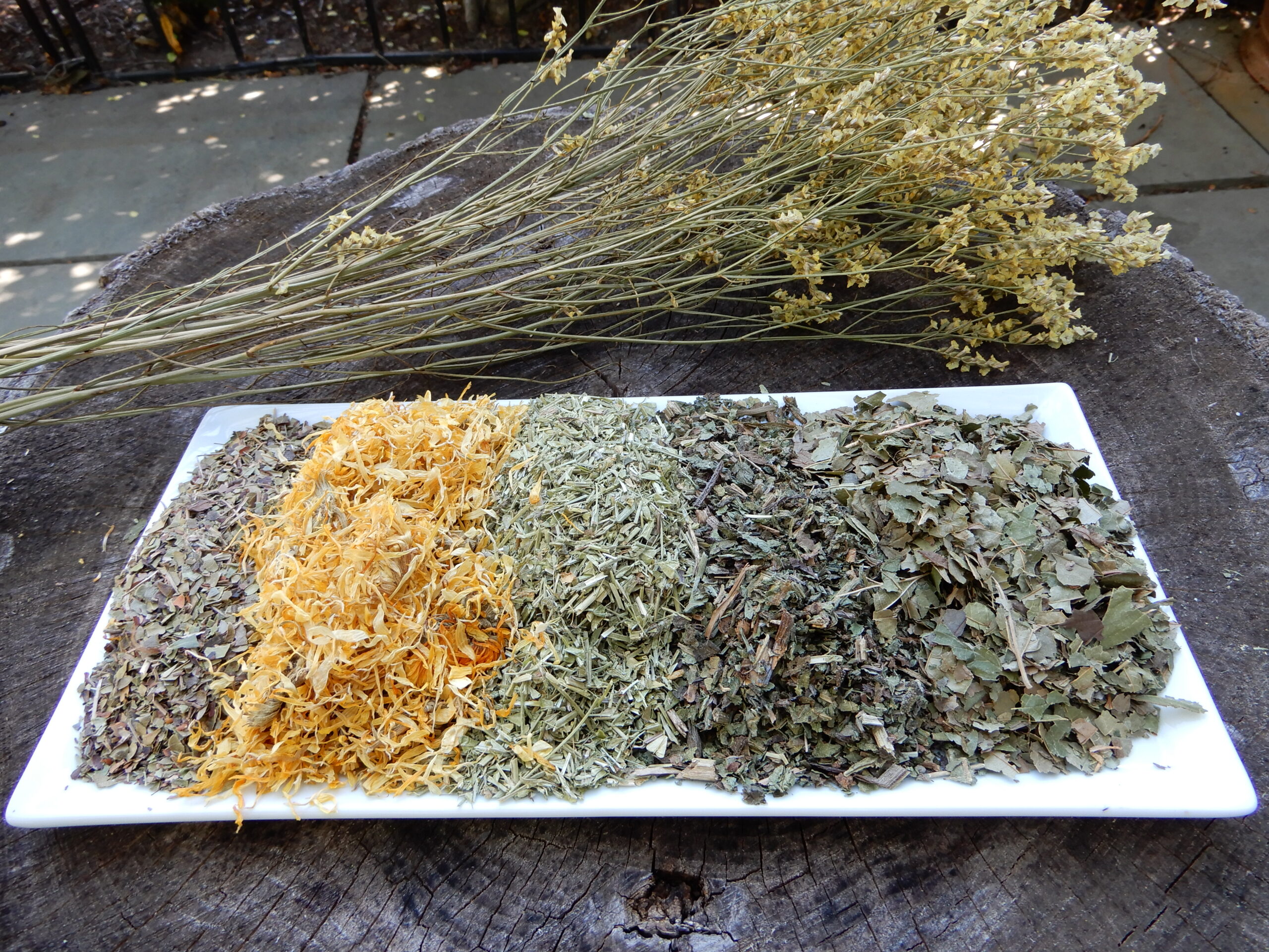 approximately 8 oz. of five 100% certified organic herbs in an organza gift bag;