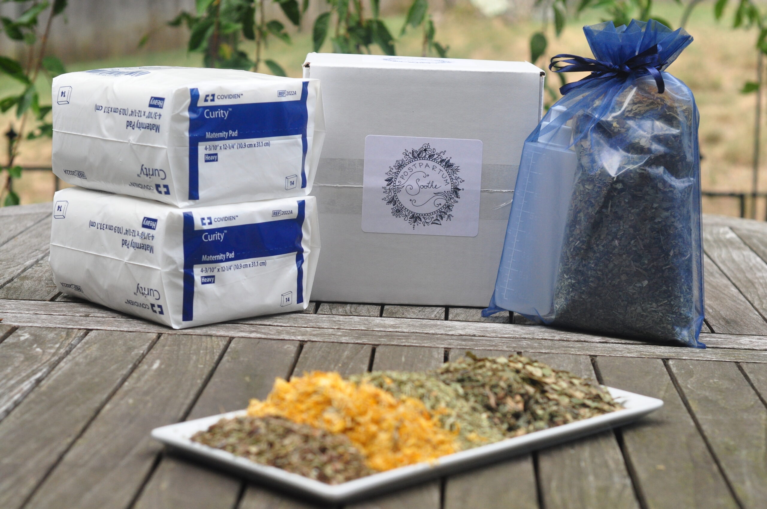 Postpartum Soothe™ contains everything you need. Each kit is attractively packaged and contains 8 oz. of 100% certified organic herbs, a hospital-grade peri-wash bottle, Covidien Curity maternity pads and detailed instructions.